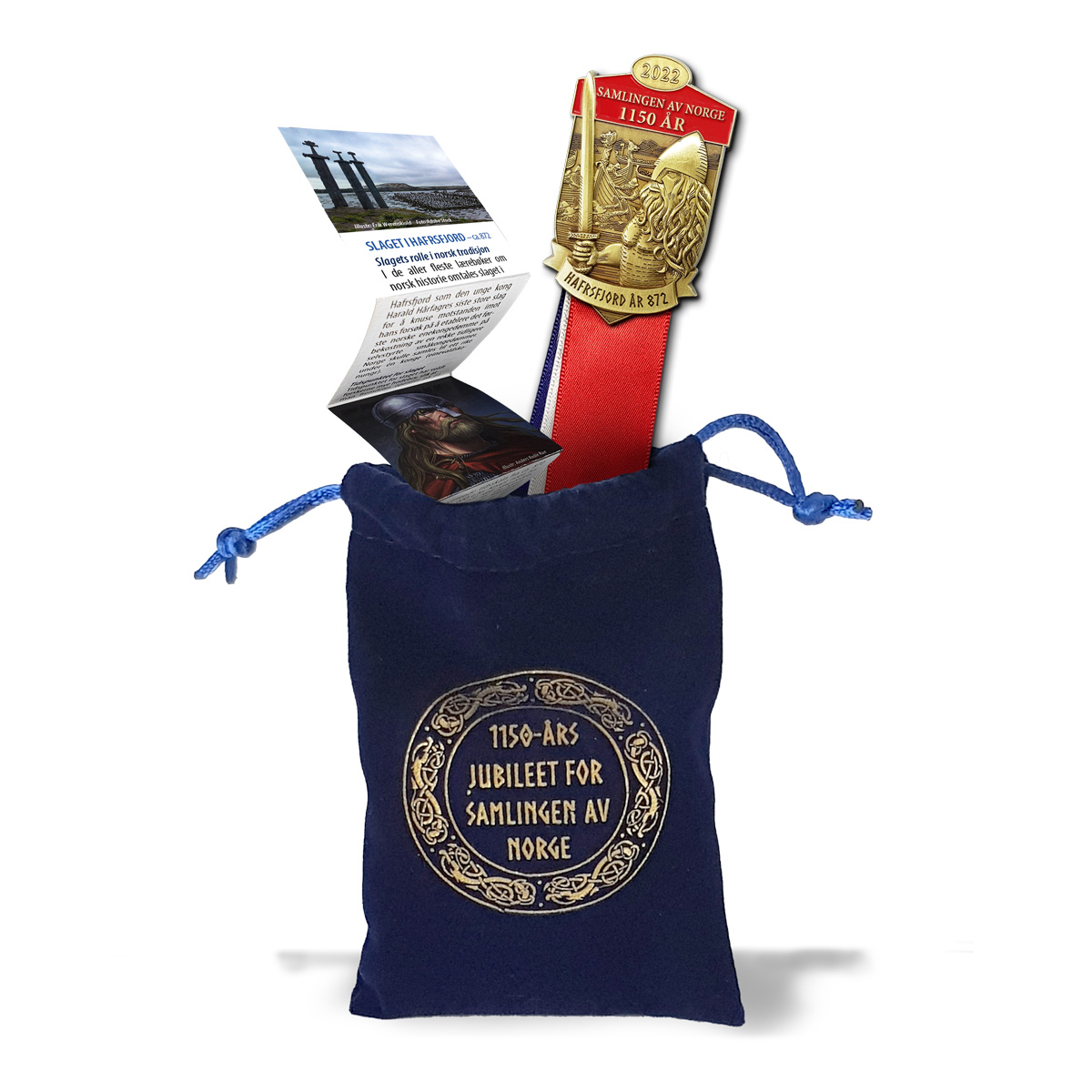 Medaljesett bestående av: medalje – velourpose m/gulltrykk – historisk folder